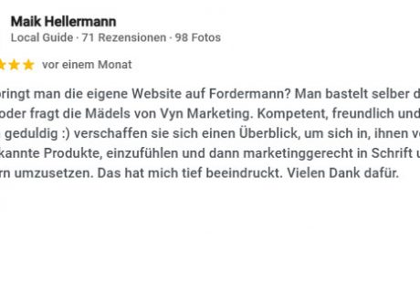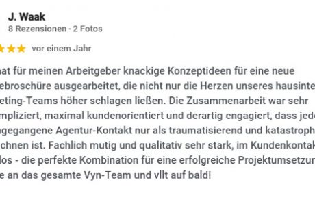 vyn ist nicht nur irgendeine Werbeagentur aus Siegen. Wir sind frech, leidenschaftlich und machen keine halben Sachen. Und davon profitierst du! Für unsere Kunden geben wir alles und versuchen immer, jedes Projekt zu ermöglichen, das auf der gemeinsam erarbeiteten Marketingwunschliste notiert ist. Bei der Umsetzung stehen wir dir mit Know-how und jahrelanger Erfahrung beiseite, ehrgeizig und loyal – denn wir sind deine Werbeagentur aus Siegen.